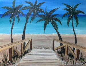 If you are looking for a fun and creative class to create some a Beach Boardwalk painting – this class is for you. Gather your friends and sign up together for this step by step instruction on how to create this beach painting with boardwalk and palm trees. No artistic ability needed – Michele will walk you through each step.