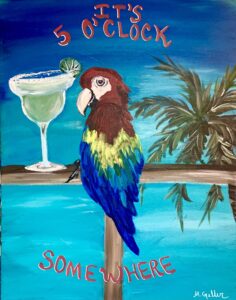 If you are looking for a fun and creative class to create a Parrot Painting and Margarita painting – this class is for you. Gather your friends and sign up together for this step by step instruction on how to create this fun tropical painting. No artistic ability needed – Michele will walk you through each step.