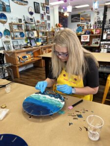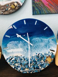 What’s included: 12 inch round clock face, resin, pigments, shells, crushed glass, resin turtles, clock parts,  and all the supplies you need to complete your masterpiece.