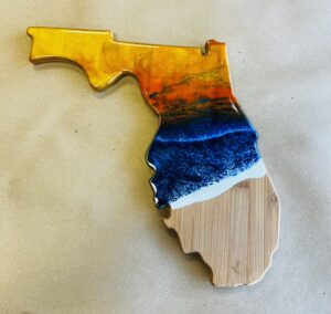 What you get: Large 12×10 inch bamboo Florida shaped cutting board, resin, pigments, and all supplies necessary to complete the project.