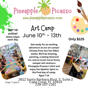 Get ready for an exciting adventure at our art camps! Choose from two fun-filled weeks. We'll be drawing, painting, creating diamond art, and so much more! Every camper will receive a Pineapple Picasso t-shirt and enjoy the Splatter Spot on the final day of camp. The camps run from 10am-12pm all four days. Parents are welcome to leave for the 2 hours and pick up their child at 12pm.