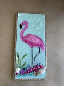 Get ready to create a tropical masterpiece! You'll paint a fabulous flamingo on a 6x14 canvas, then take it to the next level by embellishing it with shimmering crushed glass, real seashells, and a glossy coat of resin. It’s vibrant, fun, and full of beachy charm—perfect for adding a pop of paradise to your space!