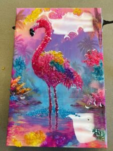 What's Included: 8x12 flamingo canvas print on a frame, colored crushed glass, resin, and all supplies necessary to complete the class.