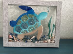 Check out this amazing class! You will paint a wooden turtle, add it to a frame, and embellish with shells, glass and resin!
